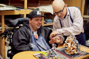 Volunteer Luca and member Terry working on a clay sculpture in the Submit to Love art studio.David: I would like to propose a toast to Sam, one of the Music co-ordinators. Music is great and it can really help people with brain injuries, and Sam is really supportive with everyone. Mark: To Katya (Day Service Co-Ordinator) whose boundless enthusiasm is infectious and who has always been encouraging and supportive when I needed it.Luca: It has to be Terry (member and Submit to Love artist), a very special friend of mine, a terrific artist with a great sense of humour and the most powerful energy and willingness to try everything!Sarah: I’d like to propose a toast to Tony Allen and Tirzah Mileham (members and Submit to Love artists) for their wonderful Art is Freedom exhibition at Rich Mix in November. So amazing to hear about their journey into becoming artists and to have their work showcased in this way. Have I also mentioned Jackie’s lamb?! That deserves a toast of it’s own!