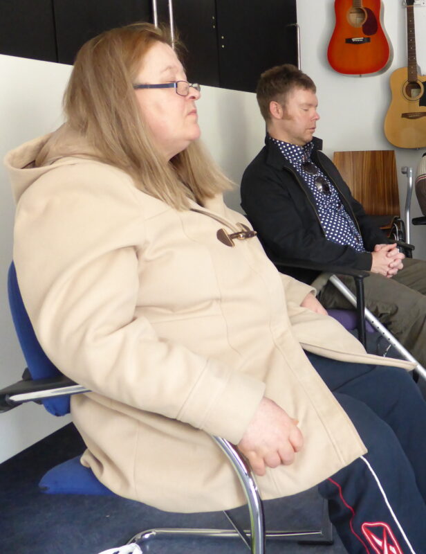 A tranquil space in Headway’s bustling day centre, the relaxation group provides a moment of quiet contemplation for our members. The leader of the group each day follows their own methods to guide the members into a peaceful state. For Toni, one of our co-ordinators and relaxation group leaders, a text book with a variety of meditative, narrative instructions is her aid of choice. Before the session began, Toni offered some insight into the group: ‘It’s a different experience for everyone, some drift off and barely hear the words your saying, they just follow the sound of the voice and the music – others follow the instructions of the narrative. The reaction after varies too, some feel ready to sleep, some feel really rejuvenated.’