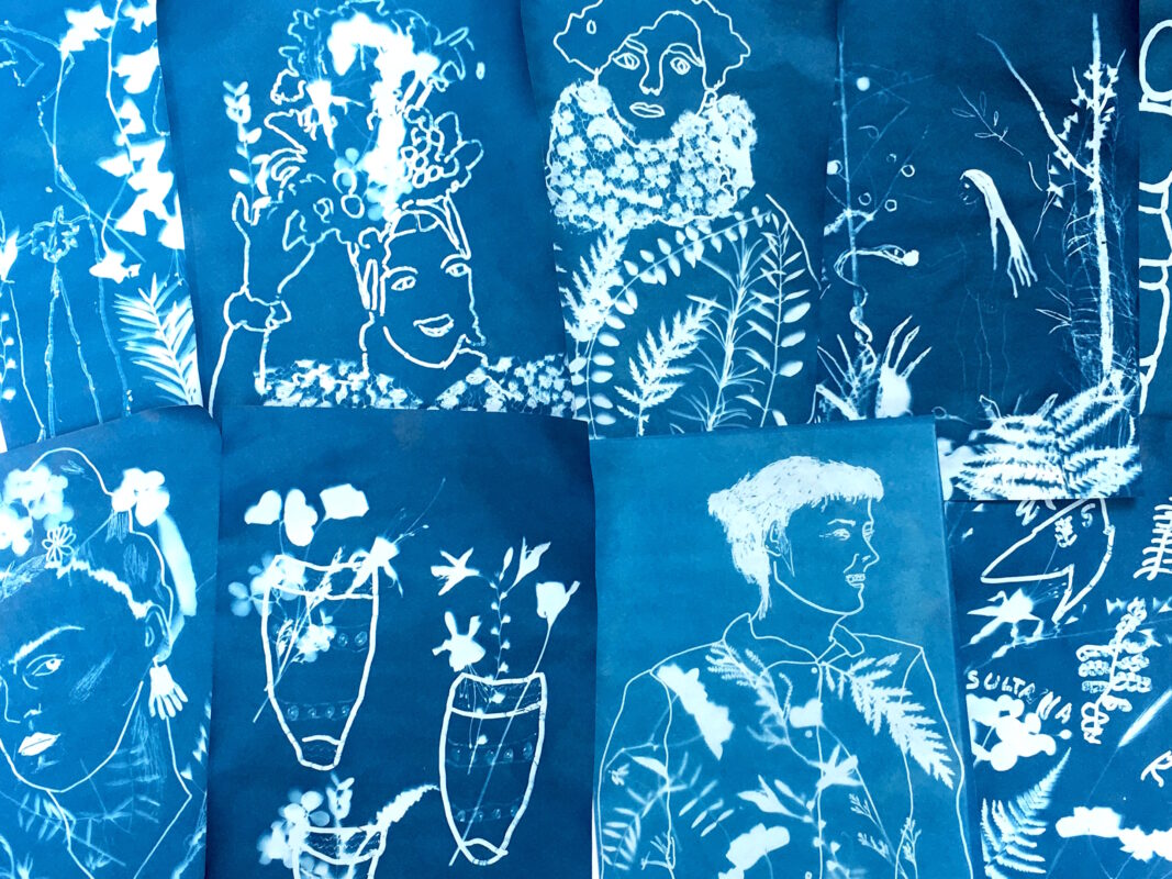 Today’s workshop was a new one for the Arch: Cyanotypes! A cyanotype is a bright cyan-blue print, made by exposing objects or drawings onto light sensitive photographic paper. As you can see from the photos, any part of the image that has been exposed to light ends up a very deep blue, while anything covered becomes bright white.