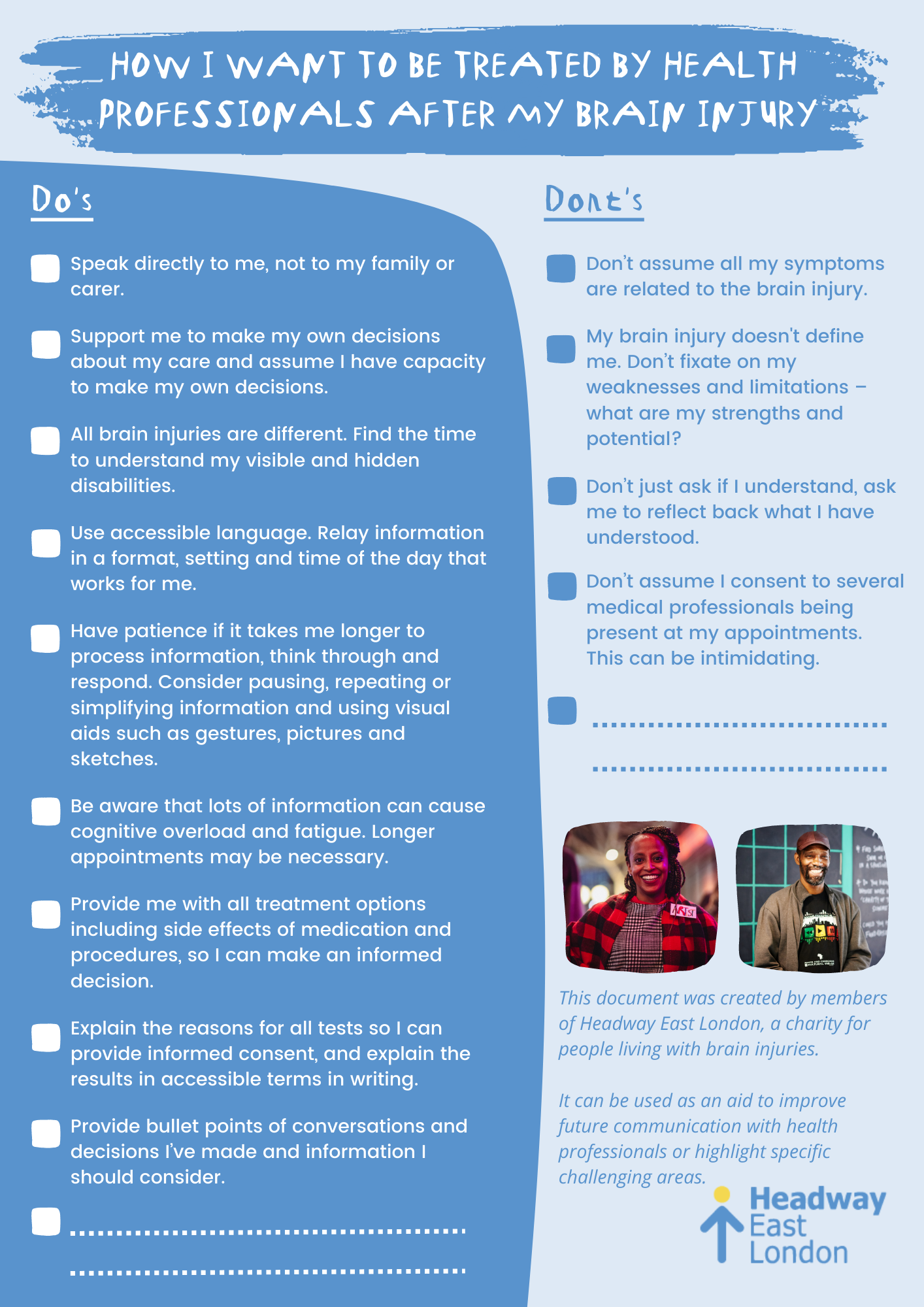 - Turn those experiences into something useful that could be helpful for other people when encountering health professionals. For example, when encountering health professionals, people living with brain injury could simply indicate on the document what adjustments might help them.